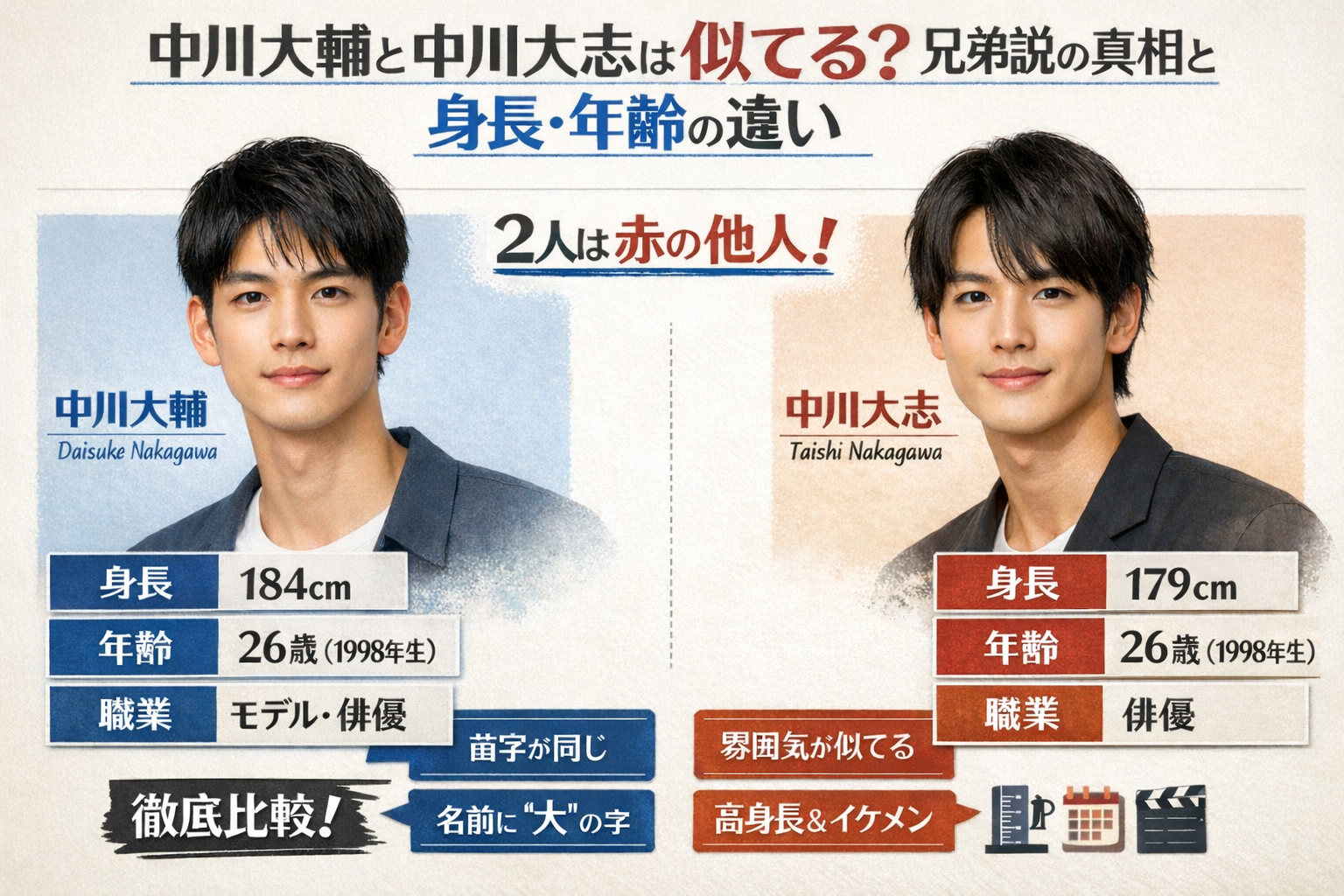 - ポイント2:身長は中川大輔が184cm、中川大志が179cmで、実は大輔さんの方が背が高いんです。