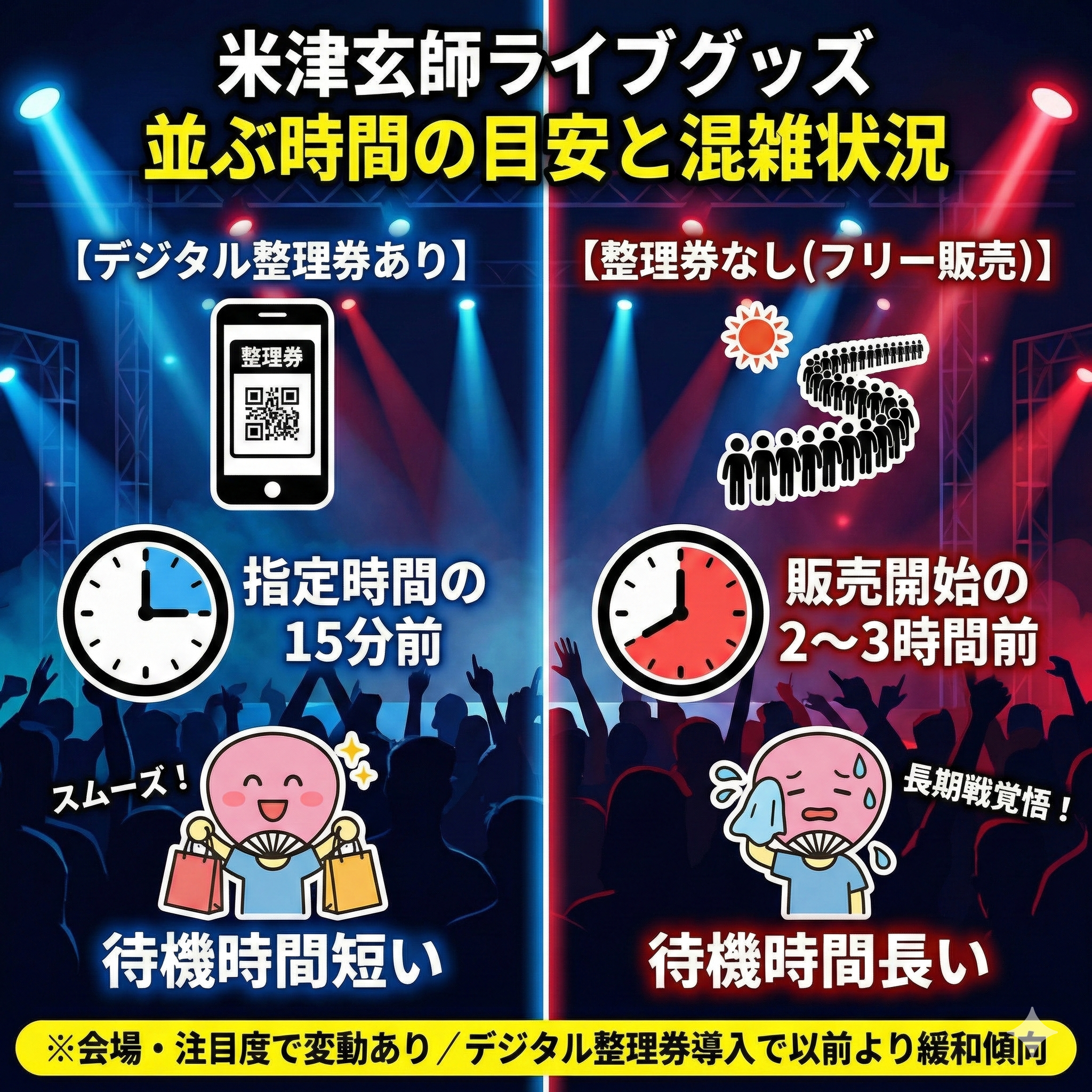 - ライブグッズに並ぶ時間は整理券ありなら15〜30分、なしなら3時間以上が目安。
