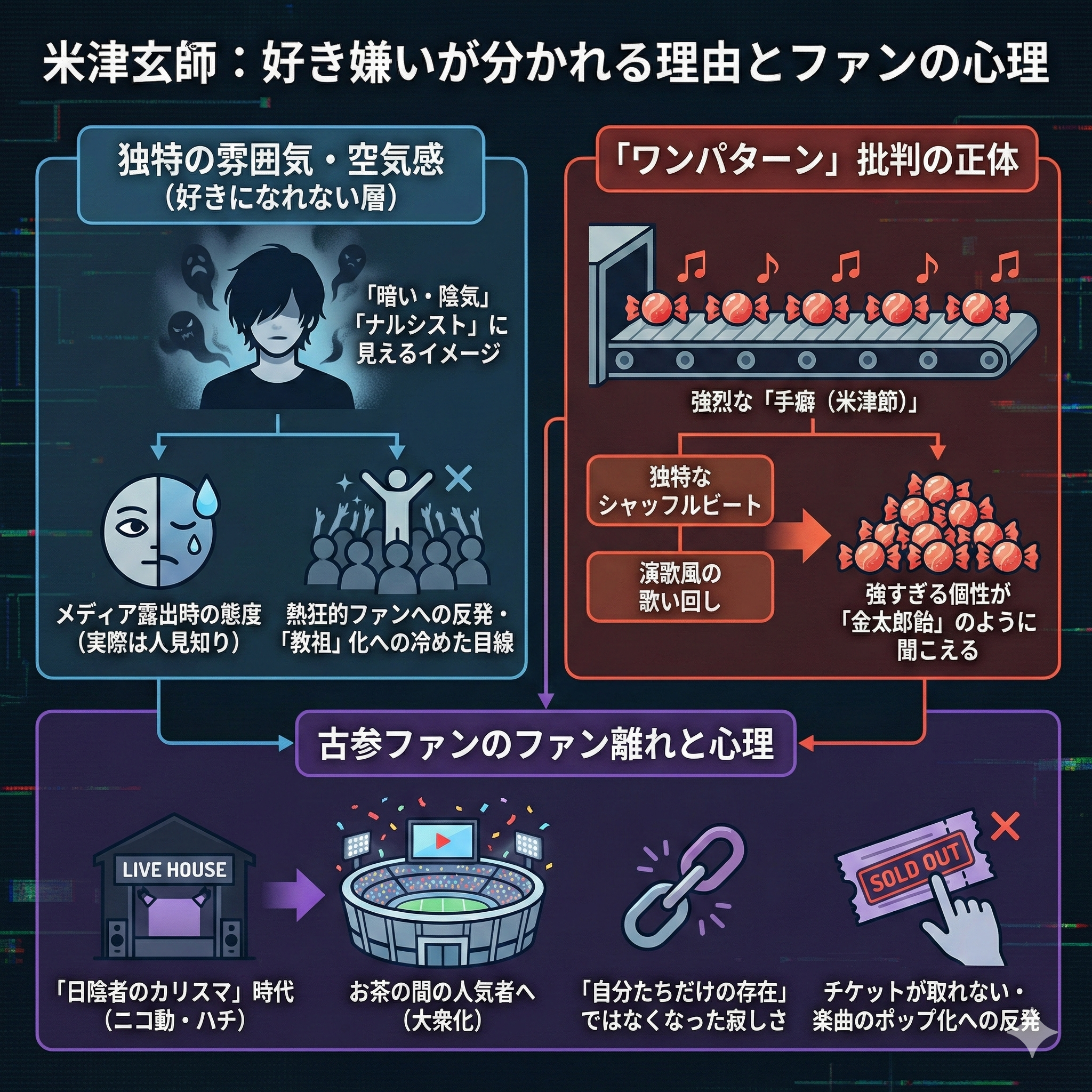 また、熱狂的なファンが彼を「教祖」のように崇める風潮に対し、冷めた目線を向けてしまい、その結果として「米津玄師そのものを好きになれない」という心理的リアクタンスが働いているケースも少なくありません。